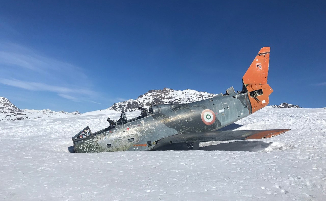 Ci-dessus, épave du Fiat G.91 T/1 Gina (MM63622, id 32-62) à Livigno, Lombardie, Italie.