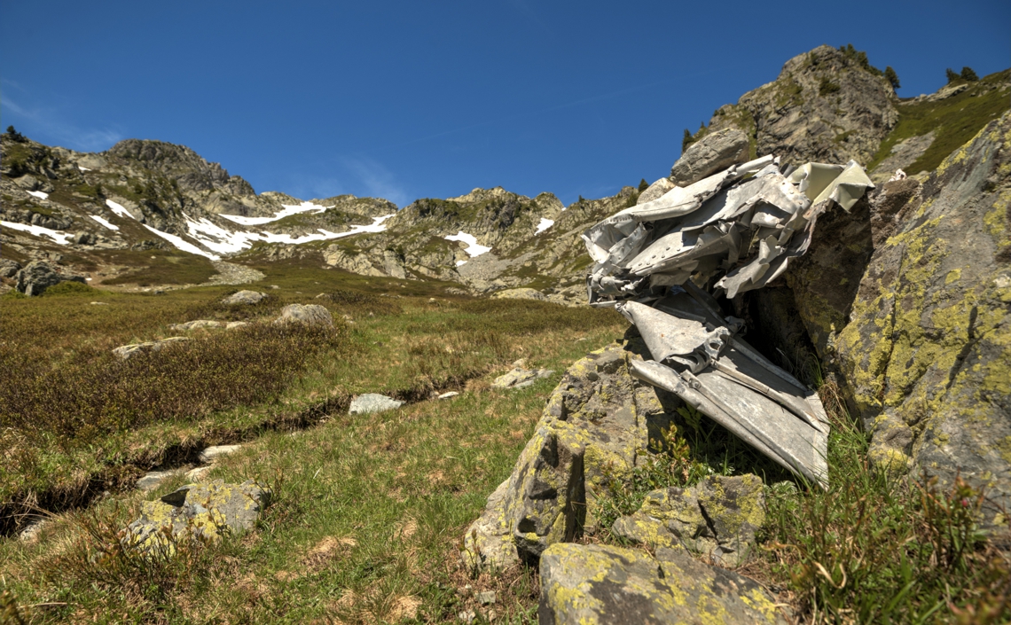 Ci-dessus, restes de l’épave du Avro 685 C1 York, (id MW126) de la Royal Air Force, accidenté le 14 novembre 1944 près du Rivier d’Allemont, Isère, France. L’épave a été trouvée par hasard sept mois après, en juin 1945.
